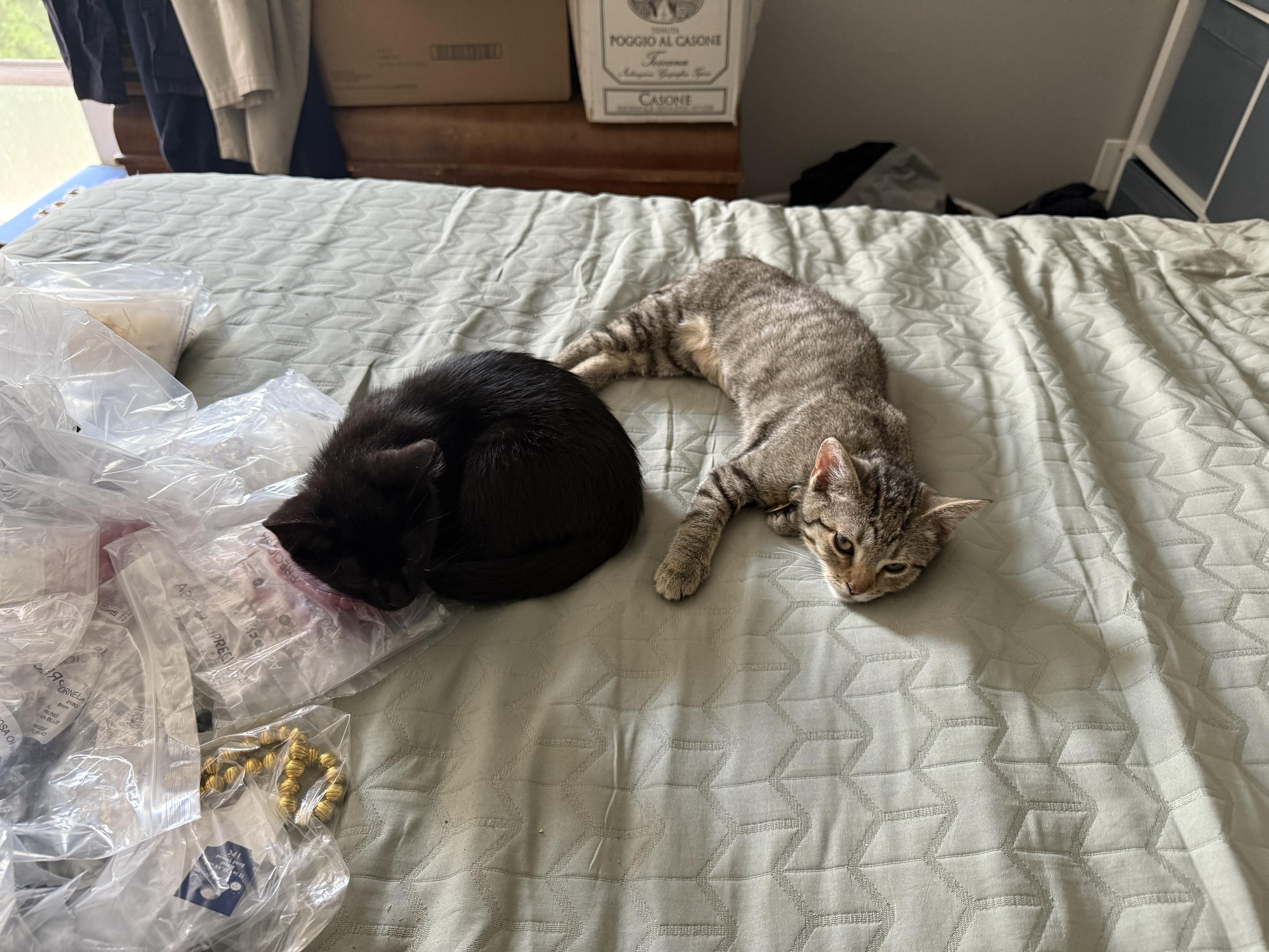 My family just adopted two kitties, one of which is black: Sesame (on the left) and Peach (the grey tabby on the right). Theyβre not proving very helpful with work yet, but theyβre a joy to have around!
