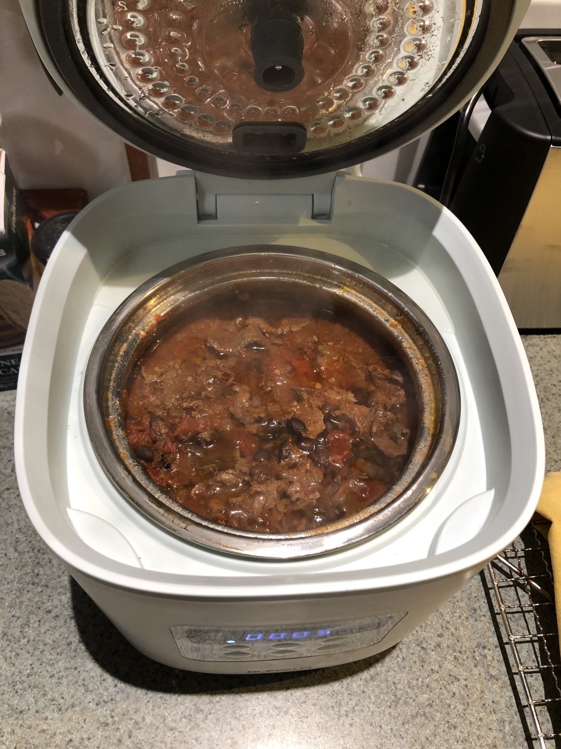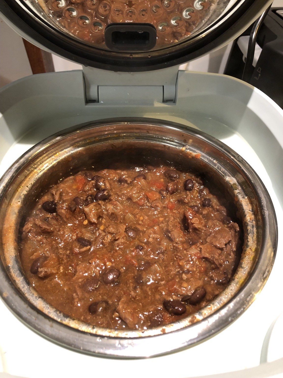 Today Iβm experimenting with dinner. My rice cooker has a βStewβ setting, so Iβve done a small Mexican beef and bean dish which Iβll make in to burritos later.