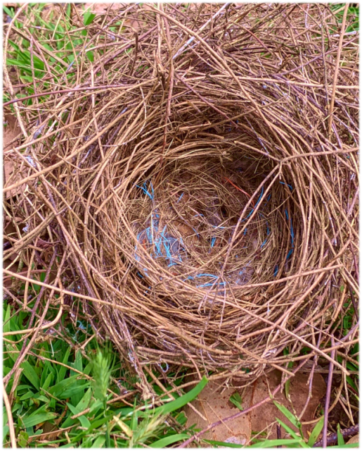 I'm not certain what bird made this nest. Clearly the nest had been blown done from its tree. I am fascinated by the colourful threads the bird found to make part of its little home (marry me! I'm a great home decorator!)