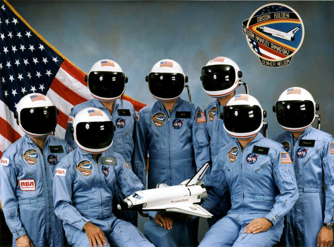 Standing, L–R: Bob Cenker, Bill Nelson, Steven Hawley, George Nelson, and Franklin Chang-Diaz. Seated: Charlie Bolden and Hoot Gibson