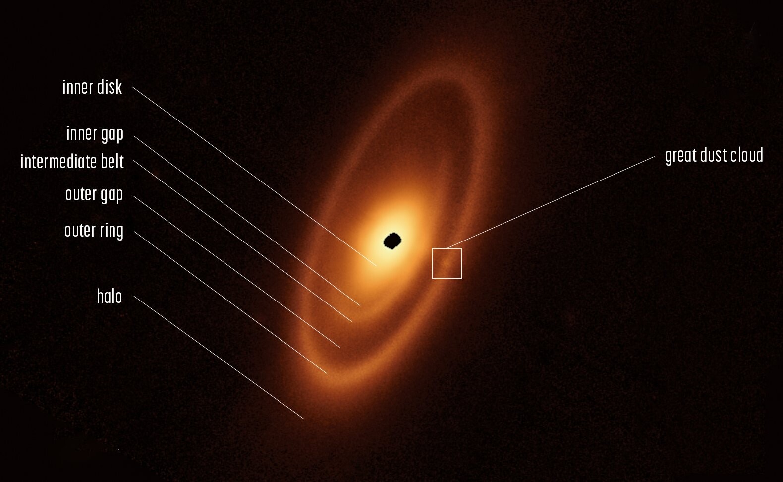 The 3 nested belts here extend out to 14 billion miles (23 billion km) from the star. That’s 150 times the distance of Earth from the Sun! The scale of the outermost belt is also roughly twice the scale of our solar system’s Kuiper belt.