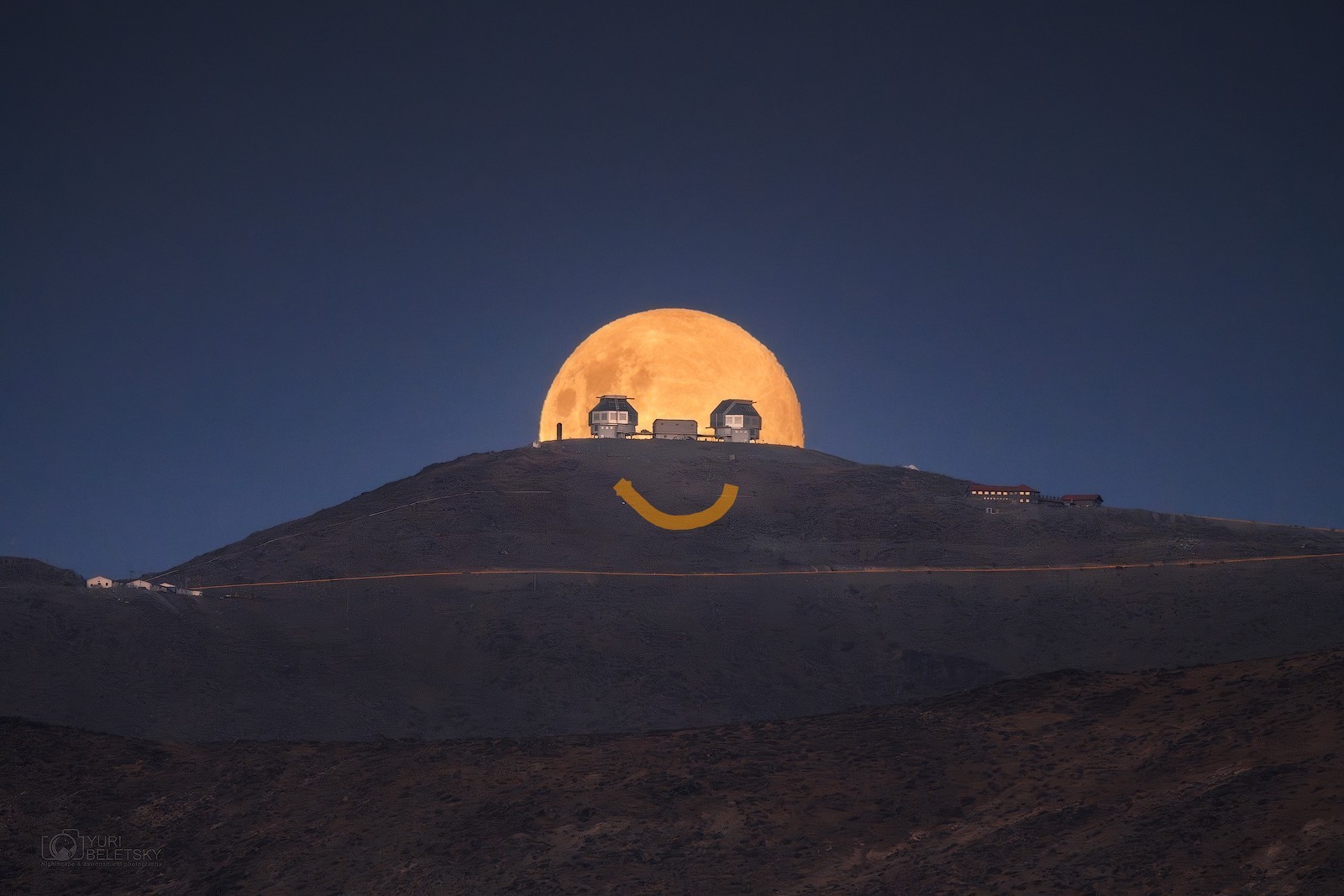 in reply to NASA • • •A nighttime photo of a hillside against the night sky. On the edge of the hillside, there are a couple buildings. The full moon hangs in the sky right behind the buildings. In all, it looks a bit like the moon had squared eyes and was peeking over the hillside.
