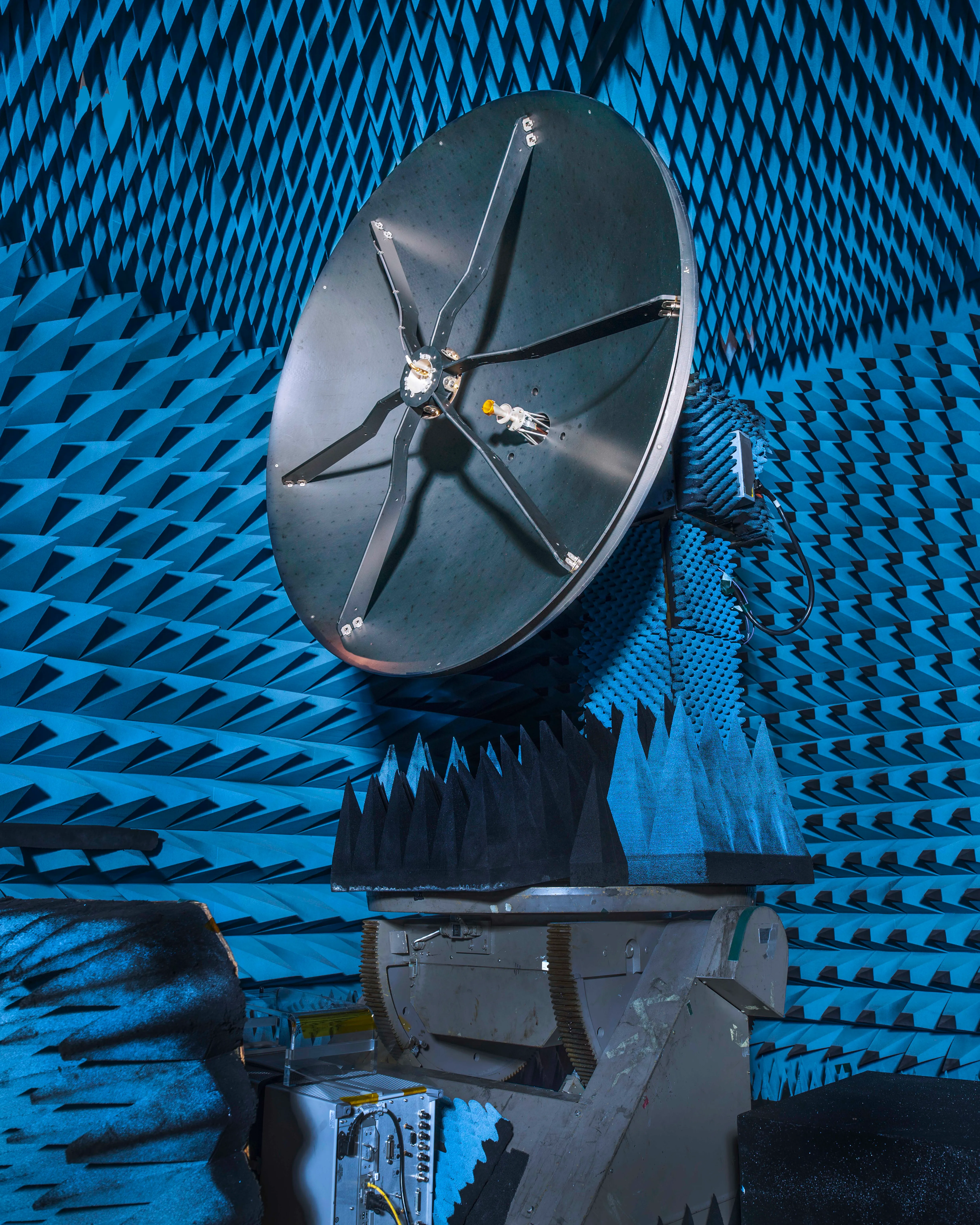 Rows upon rows of cobalt-blue spires in Goddard’s antenna chamber evoke a soundproof room from a recording studio.Rob Garner (NASA)