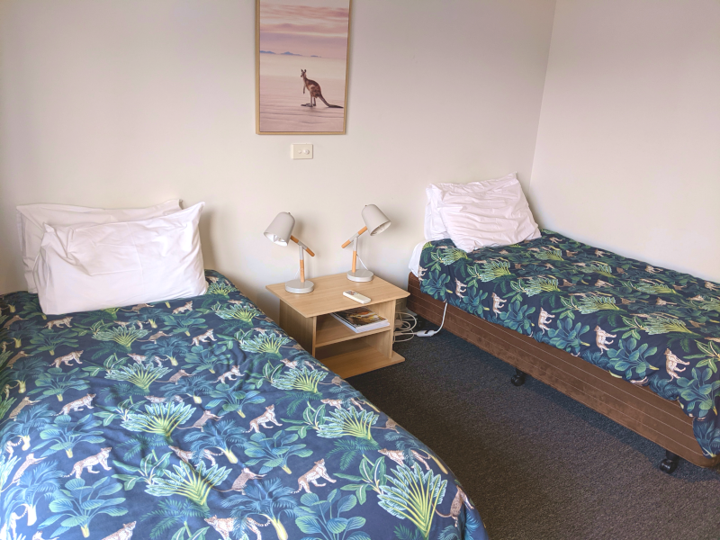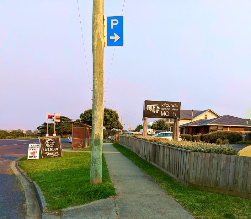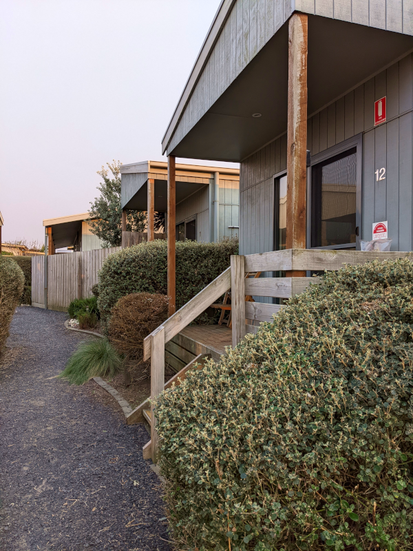 These are of my motel. I chose it because they had an electric charger in their parking lot. If you look hard in one photo in the lower right corner, you can see a little yellow from my car. My photos also are a bit purpley outside from the smoke of a bushfire in the Gippsland. Not the most glamourous place to stay, but a nice location. Just one building down was a really awesome cafe!