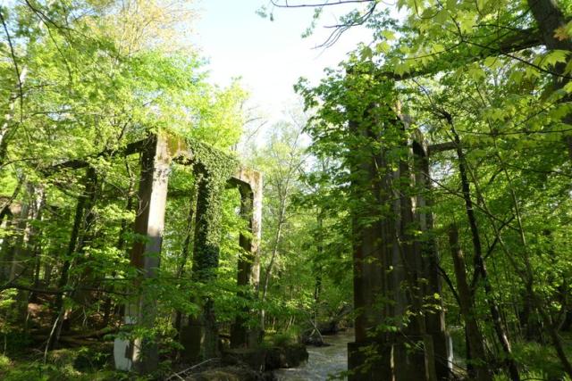 The overgrown remains of an old rail bridge rise above the valley like ancient Greek ruins.