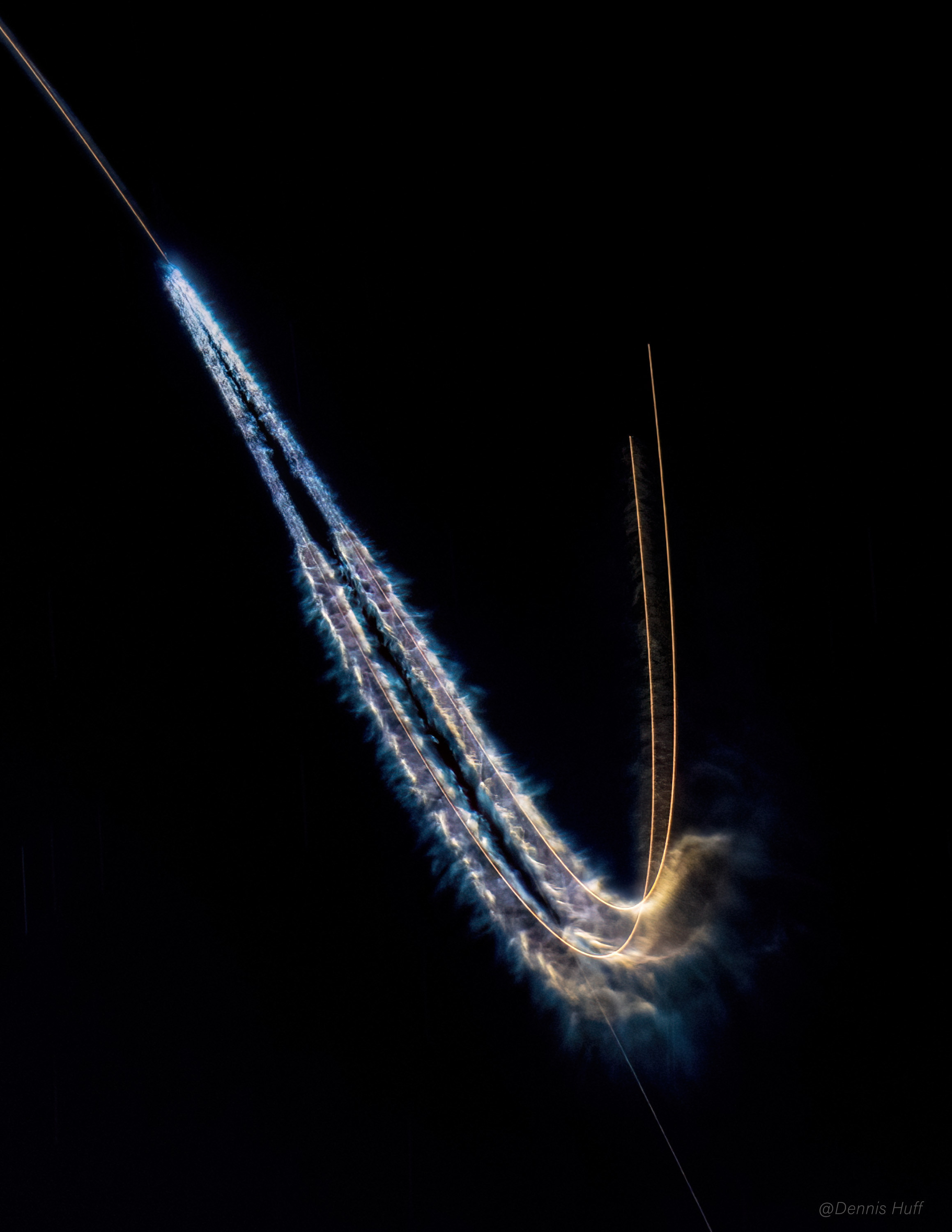 in reply to NASA • • •Black sky with two orange lines falling down on the right, then bursting into blue and purple wide flames as they curve back up towards the left, and combine into tight blue flames and then a single orange line going off screen in the top left corner. The actual booster is not visible.