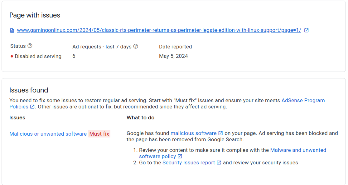 Sigh. Google flagged gamingonlinux.com/2024/05/clasโฆ as containing "Malicious or unwanted software" with no way on the adsense control panel to speak to them, to get them to recheck it.