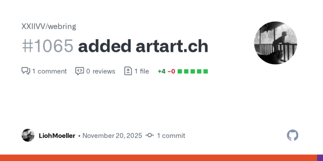 in reply to Fireside Fedi • • •added artart.ch by LiohMoeller · Pull Request #1065 · XXIIVV/webring