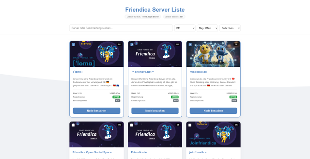 Übersicht aktiver Friendica Servern. Markiere einzelne Server, um die mit deinen Freunden zu teilen. Nutze diese Liste, um Freunde und Bekannten einen Server zu empfehlen.liste.fediserve.de
