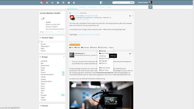 @Tuxi (Friendica) 🐧 ✅ Das ist auch, was ich mal gesehen habe. Wohl nicht im jedem View hat man alle Menuepunkte zur Auswahl. Unter /network kommt der Menueeintrag jedoch.