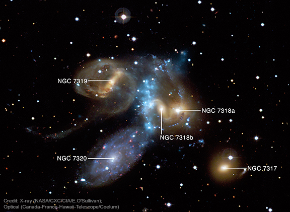 Four of the galaxies are hanging out together about 290 million light-years away, but the fifth and leftmost galaxy in the image below is actually closer to Earth at just 40 million light-years away! Here’s a labeled view from @chandraxray and a ground-based optical telescope.