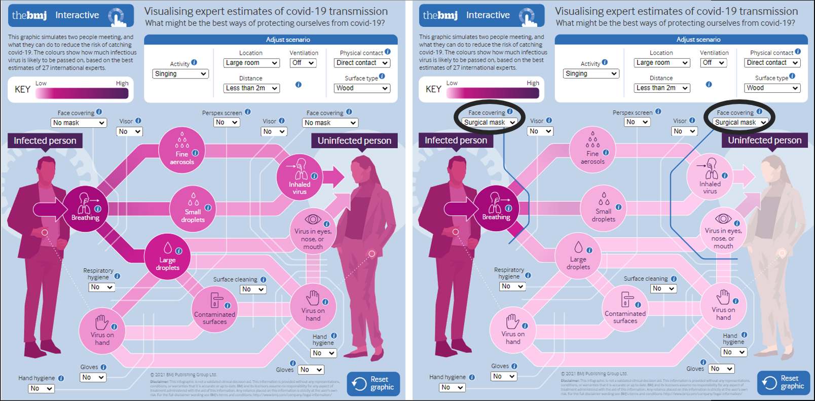 Here is a great online tool for visually estimating your #COVID19 risks. This interactive tool can show you the ways an infected person can infect others in different scenarios. Singing indoors (concerts, churches, etc.) is high risk (left), but if both people wear surgical masks, the risk is considerably less (right). #WearAMask! Here's the tool: bmj.com/content/375/bmj-2021-0…