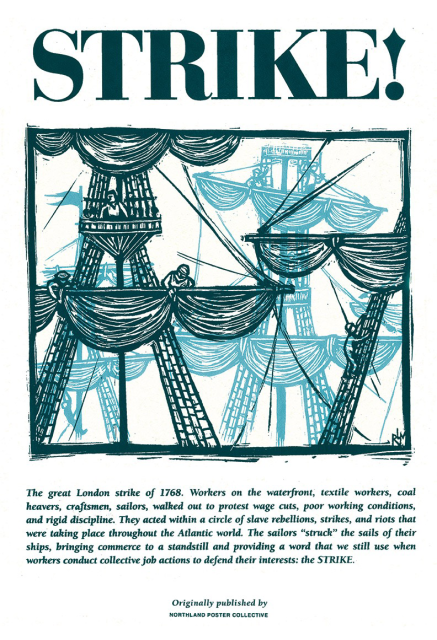 STRIKE! During the great London strike of 1768, workers on the waterfront, textile workers, coal heavers, craftsmen, sailors, walked out to protest wage cuts, poor working conditions, and rigid discipline. They acted within a circle of slave rebellions, strikes, and riots taking place throughout the Atlantic world. The sailors "struck" the sails of their ships, bringing commerce to a standstill. When workers conduct collective job actions to defend their interests we still use the word STRIKE.