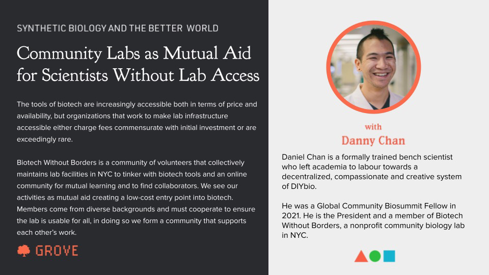 in reply to Danny (he/they) • • •Daniel Chan is a formally trained bench scientist who left academia to labour towards a decentralized, compassionate and creative system of DIYbio. He was a Global Community Biosummit Fellow in 2021. He is the President and a member of Biotech Without Borders, a nonprofit community biology lab in NYC.