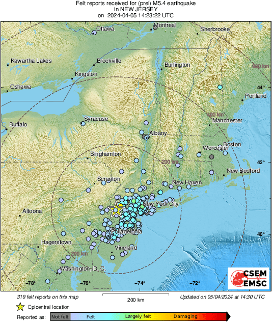 ℹEvent wrap-up: today a M4.7 #earthquake (#sismo) hit #Plainfield (New Jersey) at 10:23:20 local time (UTC 14:23:20). Shaking was felt over 200mi by approximately 36M people in United States of America and .
