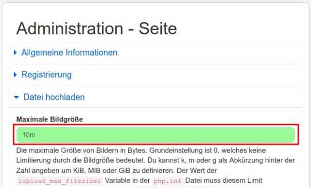 in reply to Melanie Wehowski • • •Nachdem du die ini Datei nach oben gesetzt hast, solltest du schauen, was du im Admin-Bereich (/admin/site) hinterlegst hast. Das ist nach Bild- und Videodateien getrennt einstellbar.