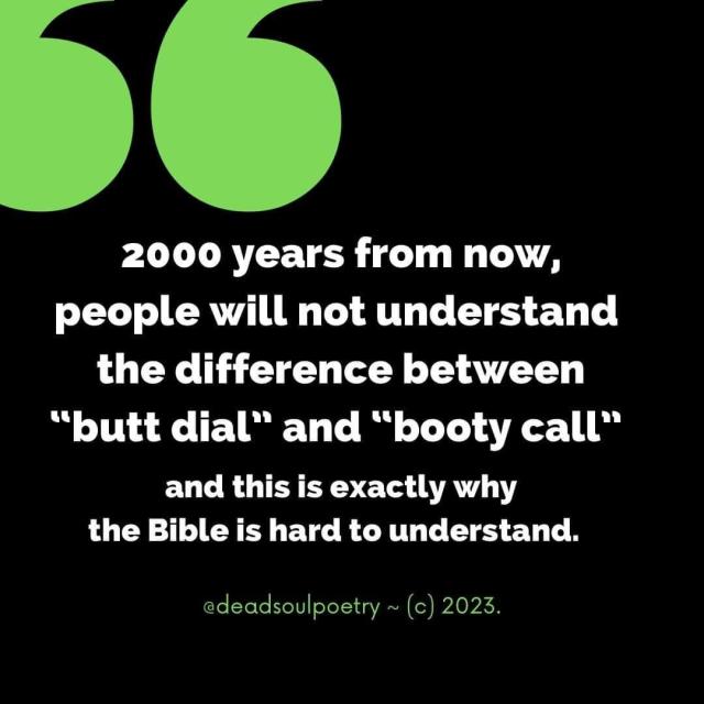 "2,000 years from now, people will not understand the difference between "butt dial" and "booty call" and this is exactly why the Bible is so hard to understand." @deadsoulpoetry 2023