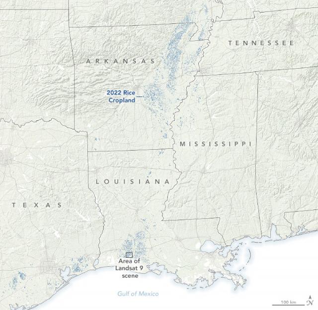 In 2021, the Rice Belt (Arkansas, Louisiana, Mississippi, and Texas) produced about 73%of all rice in the U.S. The map here shows rice-growing areas within these states (in blue) in 2022.