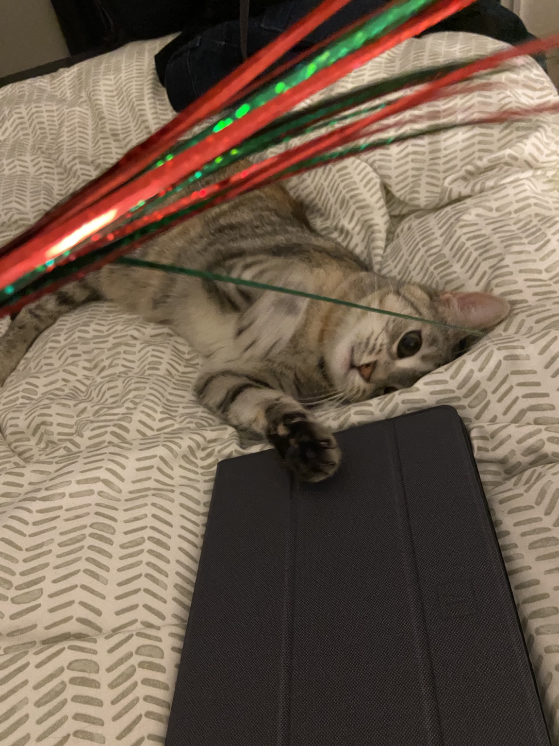 Bruno eyes a beautiful glass ornament from his perch 2/3rds off the way up our Christmas tree. There are no more glass ornaments in our tree, he got 3 later that night. The rest went back in the box.