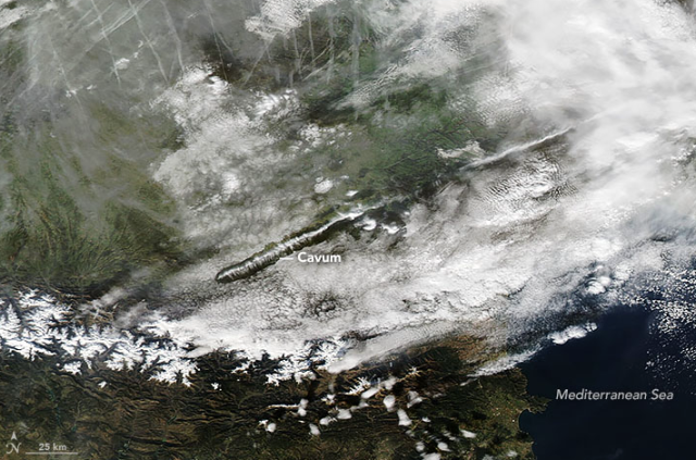 This satellite image shows a long cloud formation, called a cavum, spanning part of southeastern France.