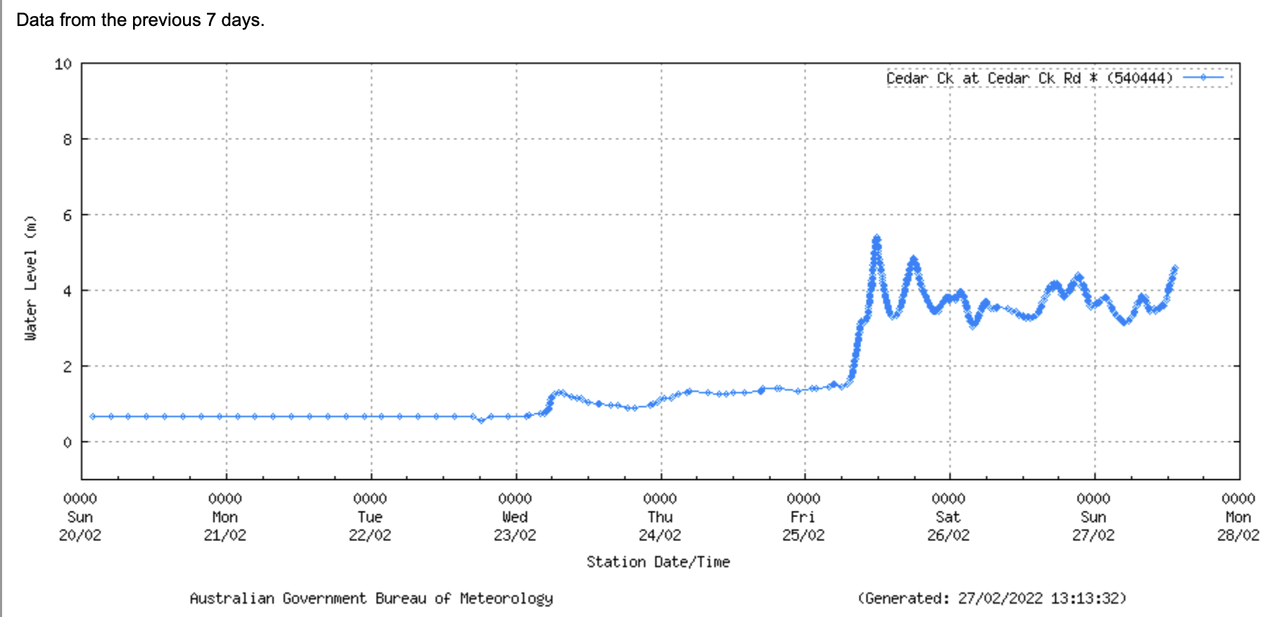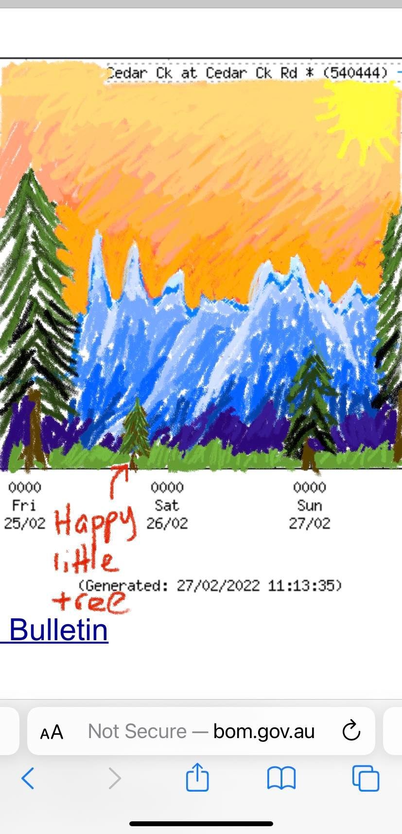 One of our locals is a bit arty, and has been making pictures from the local creek flood level graph. This time she did a Bob Ross tribute.