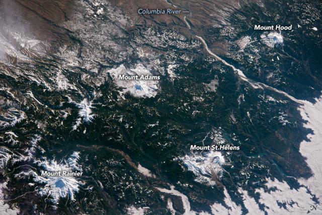 Four of the range’s prominent volcanoes—Rainier, St. Helens, Adams, and Hood—were on full display in February 2022.go.nasa.gov