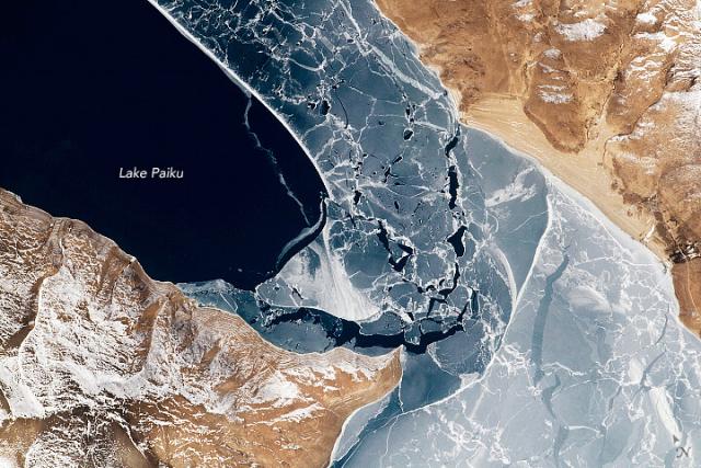 This deep lake on the southern Qinghai-Tibet Plateau freezes over during winter, curbing the large changes in lake level observed during other seasons.go.nasa.gov