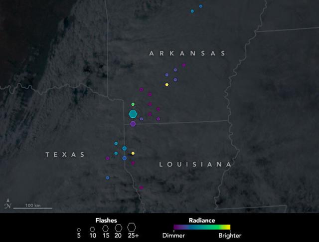 Size represents number of lightning flashes. Colors indicate flash brightness. The data are overlaid on a @noaa GOES image. go.nasa.gov/3hNlp1c
