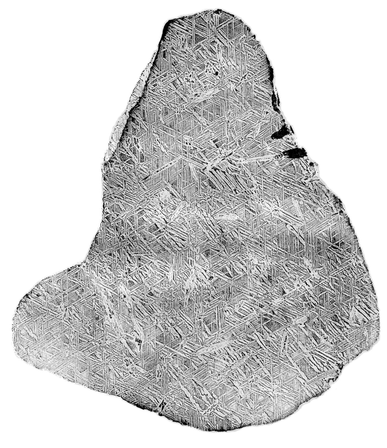 Drawing of an etched sliced of the "Bewitched Burgrave" or Elbogen (Loket) Iron Meteorite from von Schreibers' book, "Beiträge zur Geschichte und Kenntnis meteorischer Stein- und Metall-Massen, und der Erscheinungen, welche deren Niederfallen zu begleiten pflegen" (1820).