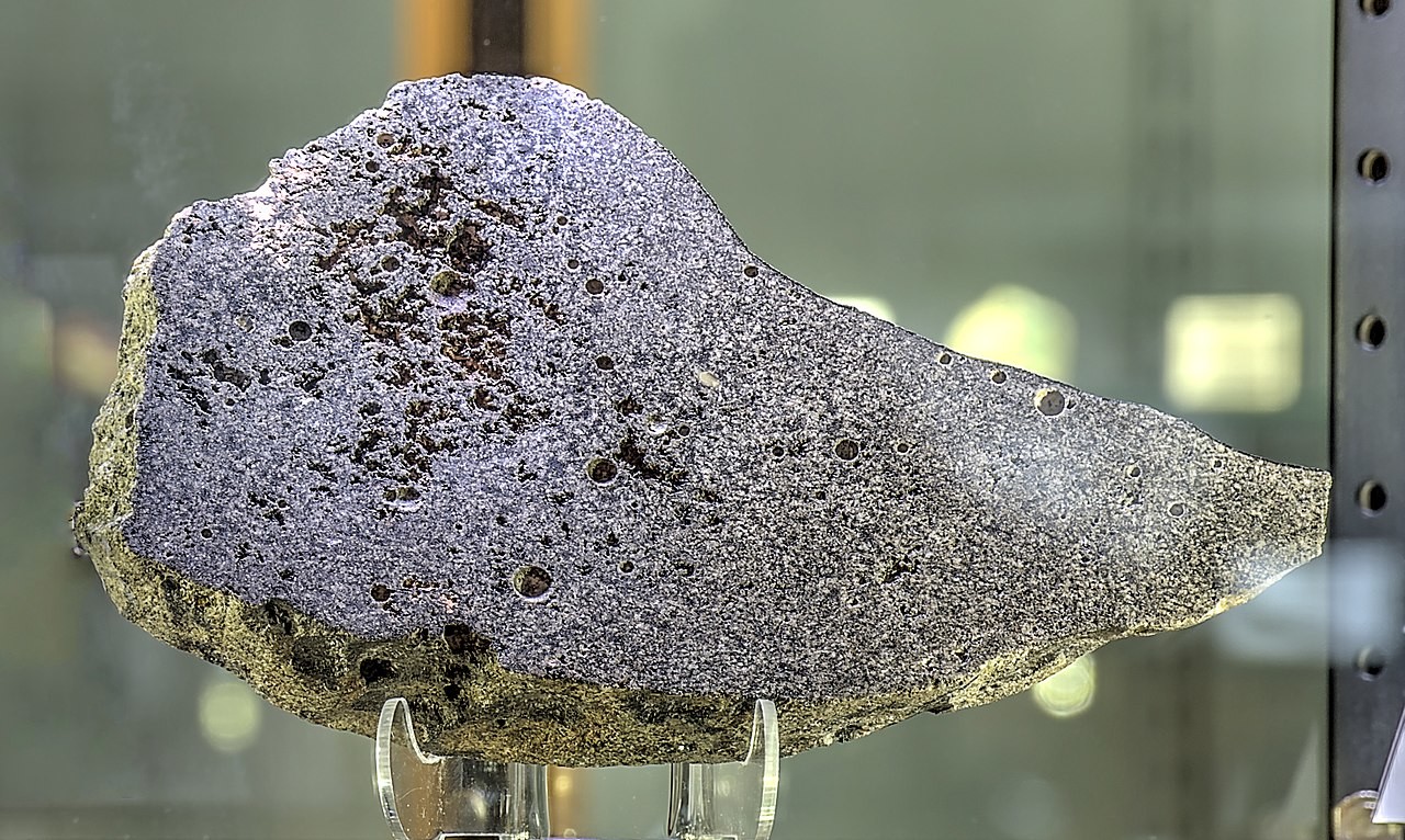 A slice of the Los Angeles Meteorite on display at UCLA. Found in 1999; Los Angeles, California.