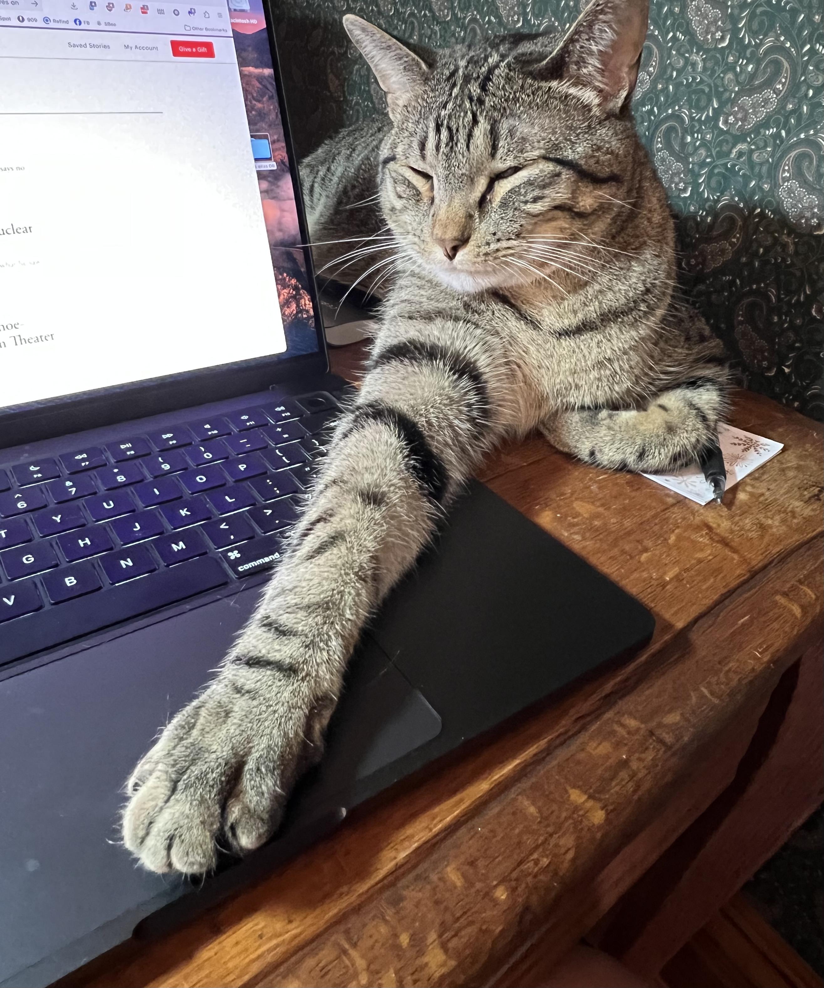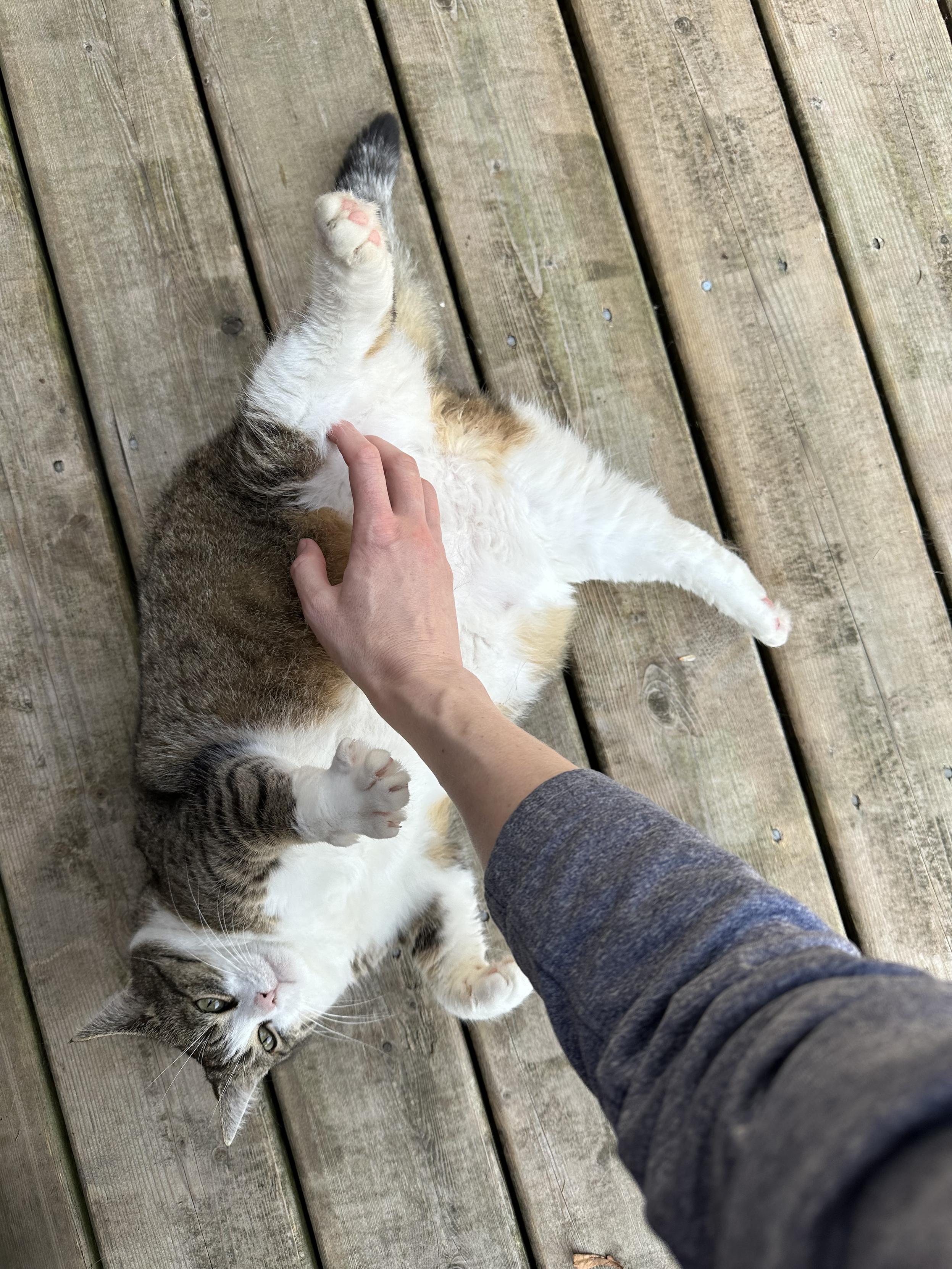 Bella loves to have the inside of her hind legs scratched (look at those air biscuits! 😻). Benny loves to use me as a mobile observation platform so he can survey his kingdom.