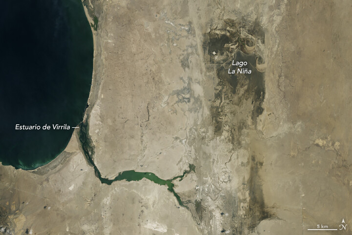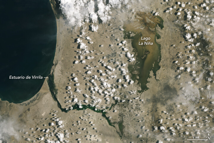 These #Landsat images show before (left) and after (right) flood waters from two nearby rivers filled Lago La Niña. 🌧️ go.nasa.gov/40XmxAN