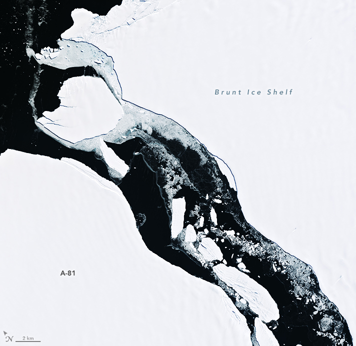 This #Landsat image from Jan. 25 shows the A-81 berg on the left and the new front of the Brunt Ice Shelf on the right.