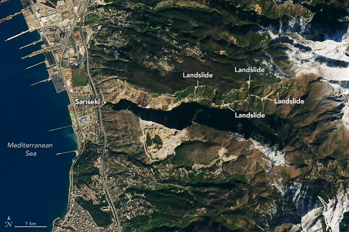 This #Landsat 9 image shows small landslides along a valley east of Sarıseki, Türkiye, on Feb. 14. go.nasa.gov/3IROLGI