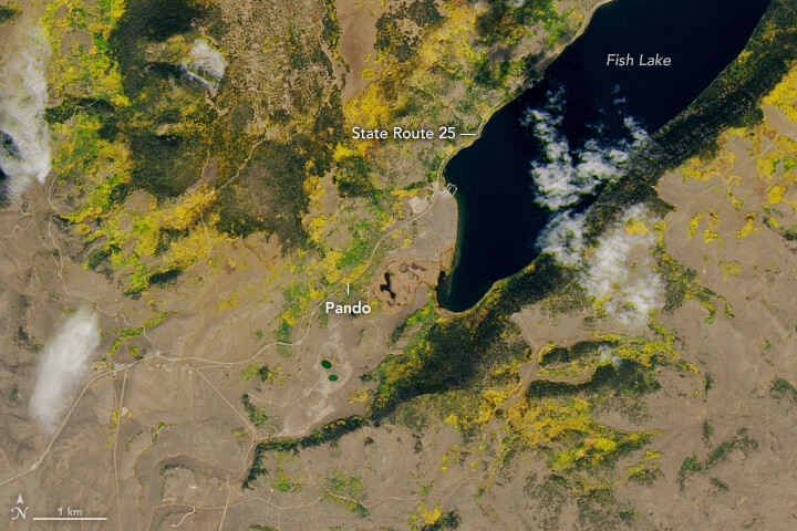 In this image by #Landsat 9, Pando’s yellow leaves are visible for about 200 meters on either side of State Route 25. go.nasa.gov/3KPIeNU