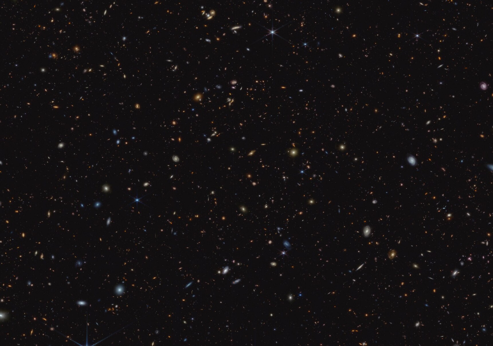Astronomers using NASA’s James Webb Space Telescope have discovered a thread-like arrangement of 10 galaxies that existed just 830 million years after the big bang.Jessica Evans (NASA)