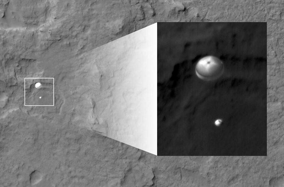 NASA's Curiosity rover and its parachute were spotted by NASA's Mars Reconnaissance Orbiter as Curiosity descended to the surface on Aug. 5 PDT (Aug. 6 EDT).NASA Mars Exploration