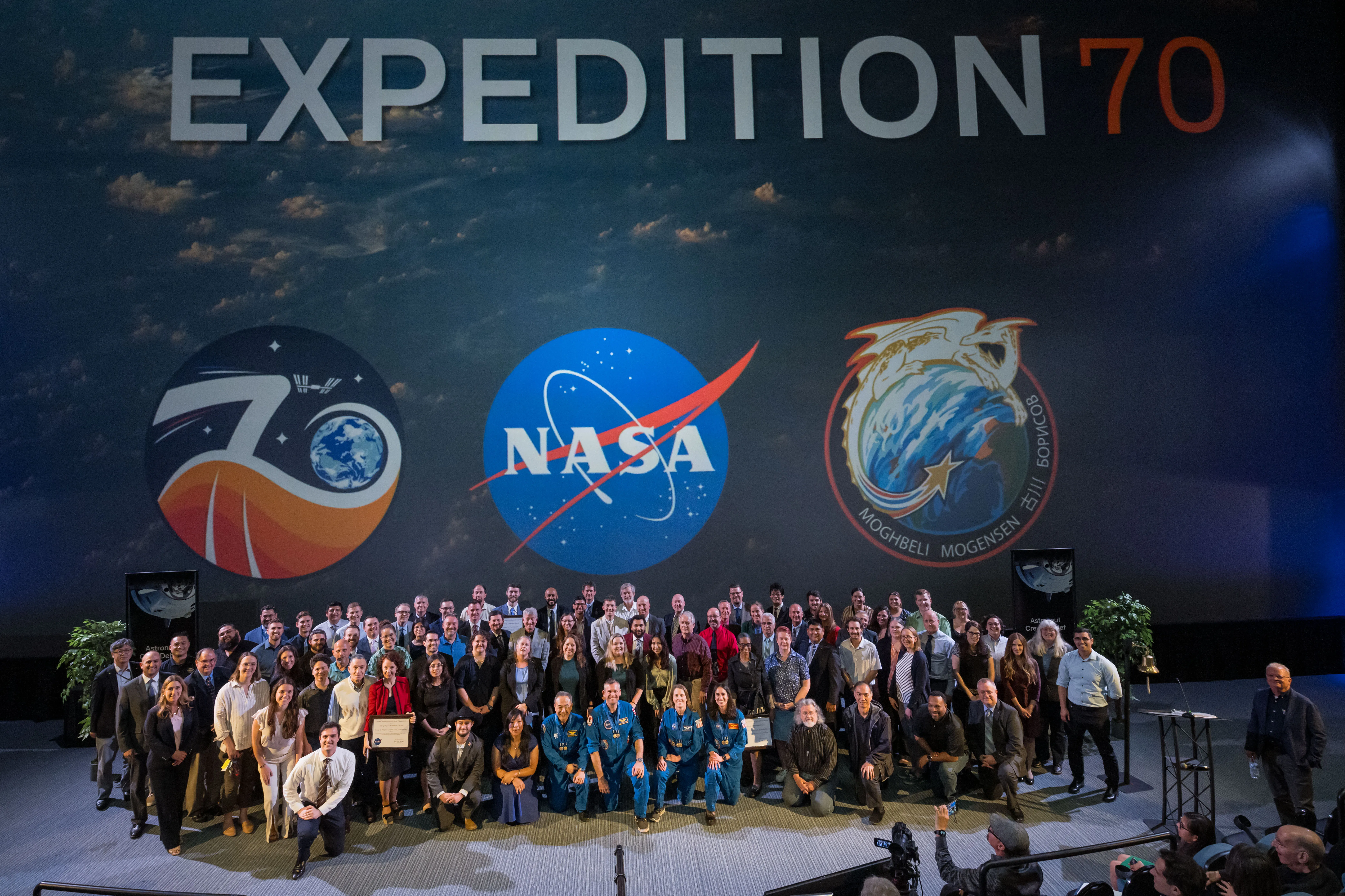On May 16, 2024, a crowd of more than 500 people gathered at Space Center Houston's IMAX theater for the Expedition 70 crew debrief and awards ceremony. CrewSumer Loggins (NASA)