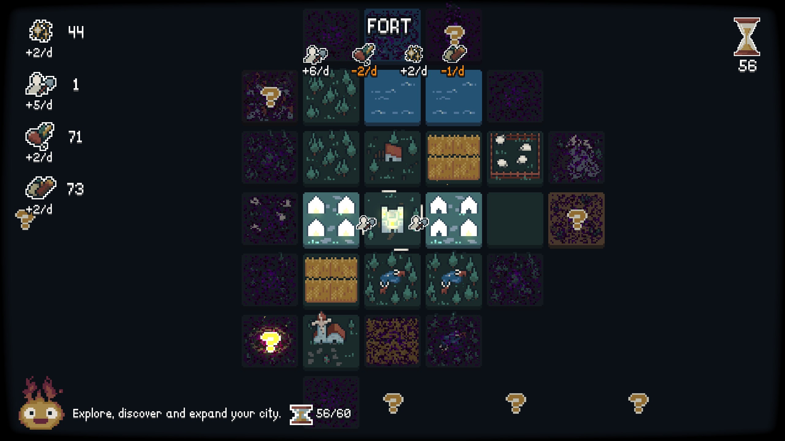 Try the demo of Lueur and the Dim Settlers, a minimalist and relaxing survival builder