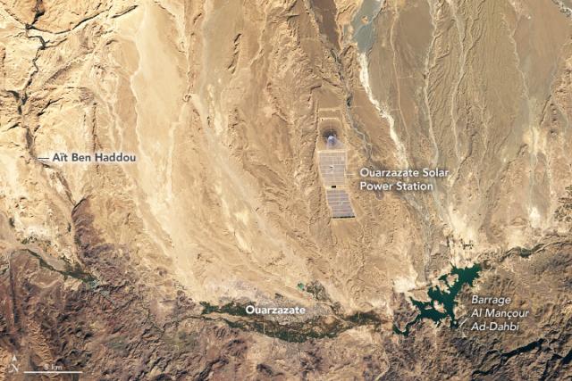 The dry, sunny basin is the site of a solar power station that supplies electricity to nearly 2 million Moroccans.go.nasa.gov