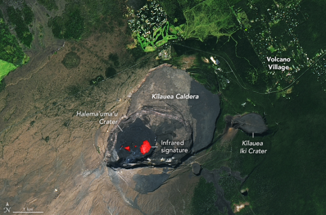 This image made from #Landsat 8 data shows a satellite view of the volcano from Jan. 11 overlaid with the infrared signature (in red) from the lava’s heat.