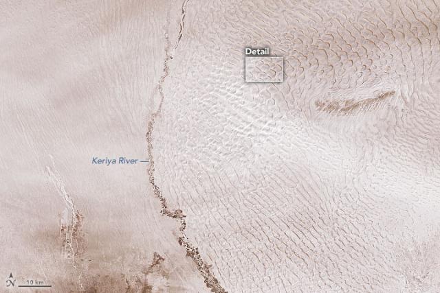 The #Landsat 9 images show a snow-covered desert landscape and sand dunes near the Keriya River in the Xinjiang region of western China, taken after a powerful winter storm earlier this month. ❄️go.nasa.gov/3JvzlZu