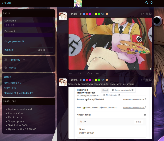 chud instance, seems to mostly interact with baest and poast users, weird attempts at harassment