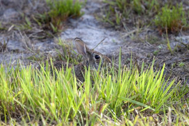 In this image from May 4, 2017, a rabbit is nearly obscured by grass at NASA’s Kennedy Space Center in Florida. Kennedy shares a border with the MerrittNASA