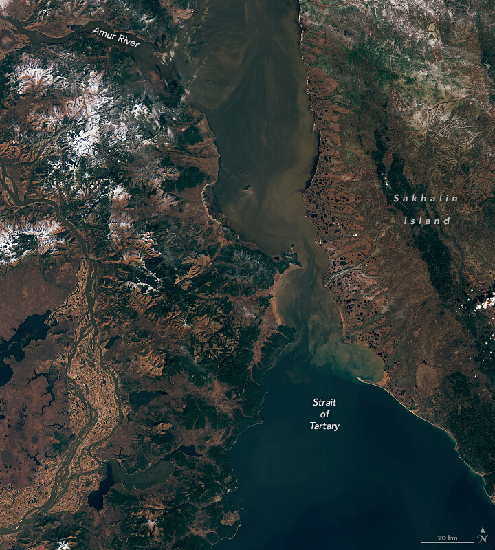 Sediment and dissolved organic matter carried by the Amur River contribute to the colorful waters visible in the strait.go.nasa.gov