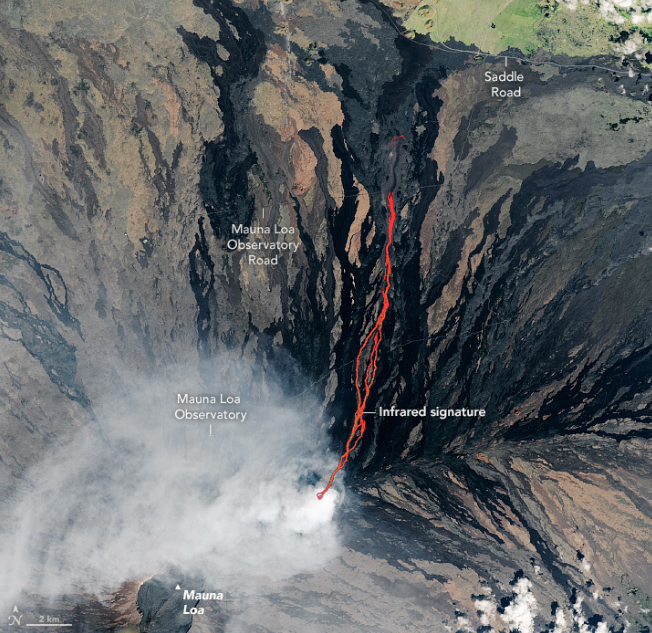 The Landsat 9 satellite acquired this image of the eruption as lava flowed past the Mauna Loa Observatory toward Saddle Road.go.nasa.gov