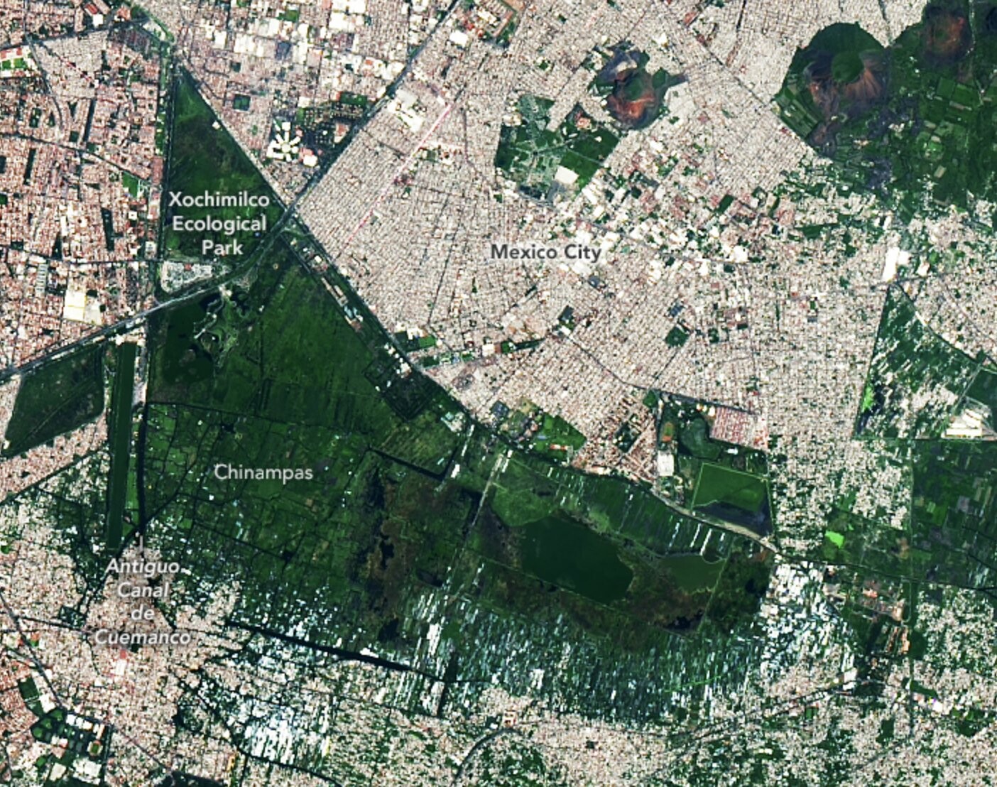 Many of the canals and floating fields used by ancient civilizations in the Valley of Mexico were lost as lakes were drained, but some examples of the watery fields remain in Xochimilco.go.nasa.gov