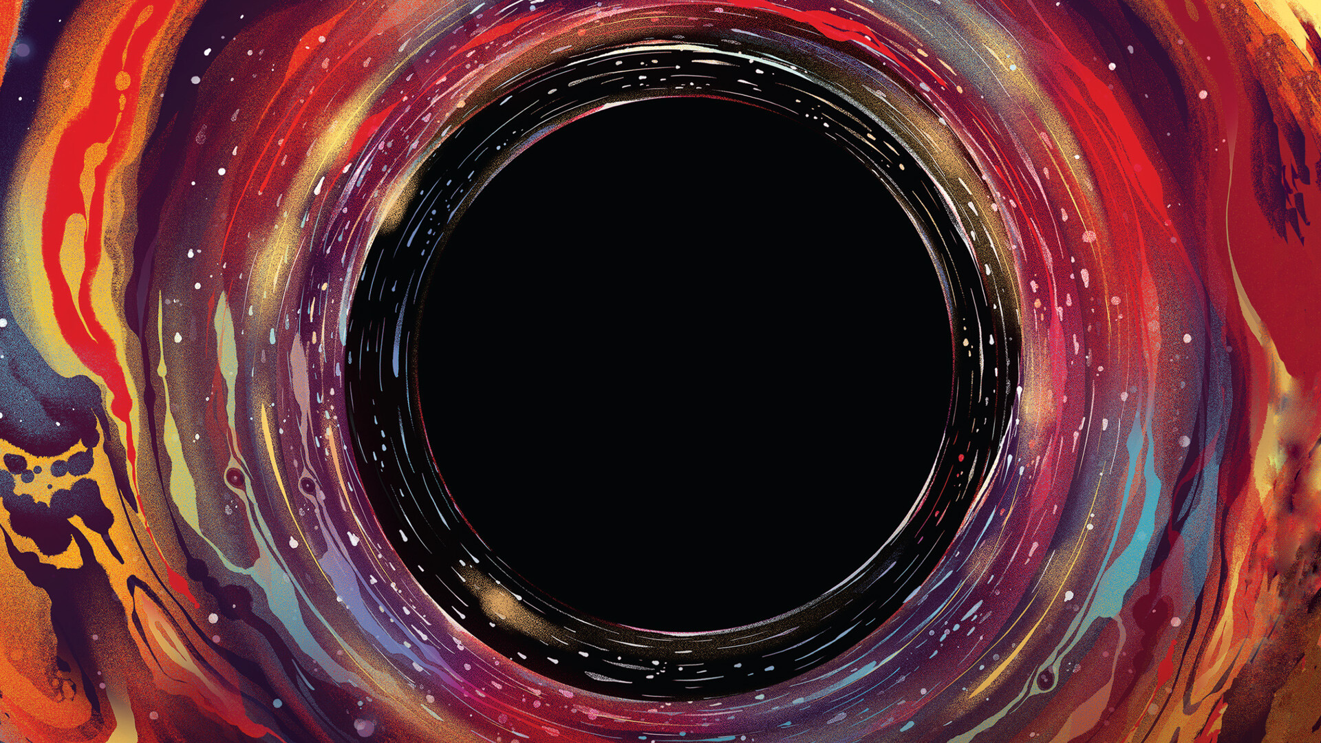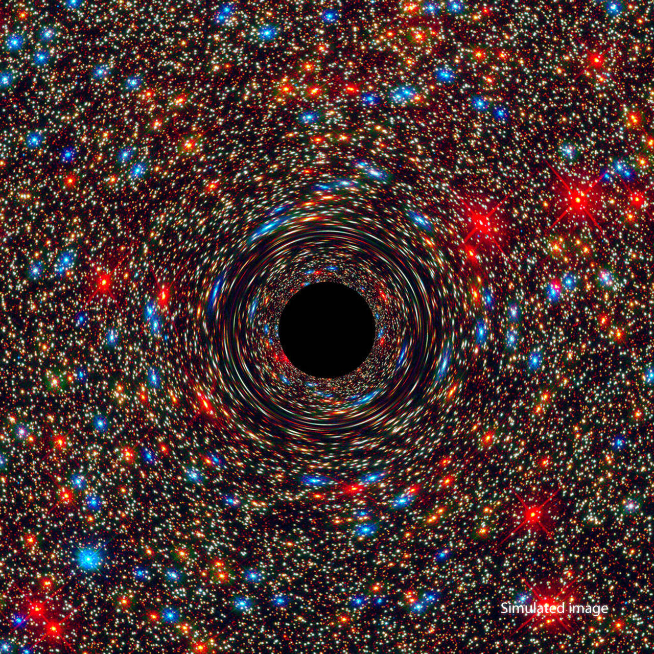 Most galaxies, like our Milky Way, have black holes at their centers. This computer-simulated image shows what that might look like. In the center is the black hole’s event horizon, where no light can escape.