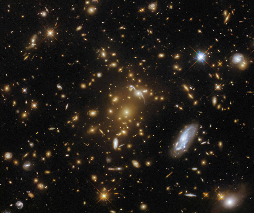 A vast galaxy cluster lurks in the center of this image from the NASA/ESA Hubble Space Telescope.Andrea Gianopoulos (NASA)