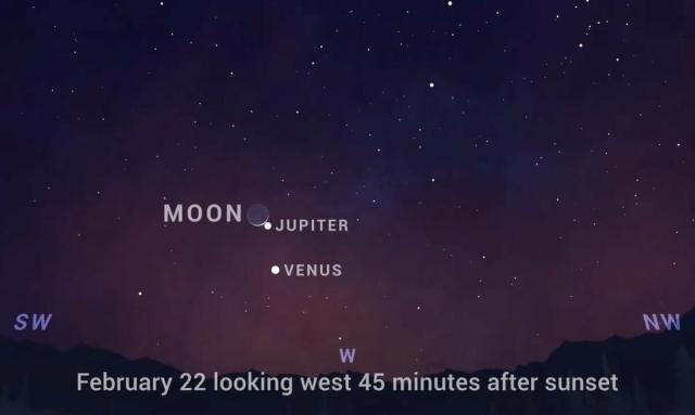 If you have clear skies after sunset this evening, watch for the crescent Moon with bright Jupiter and Venus nearby. Details: solarsystem.nasa.gov/skywatchi…